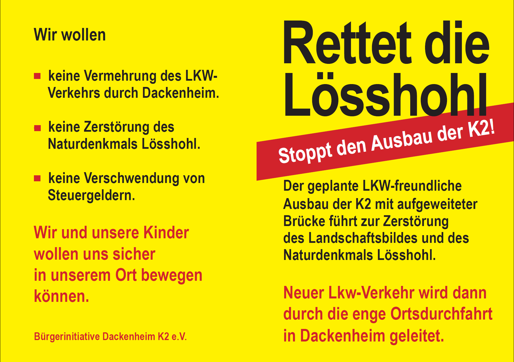 Es ist wichtig, vor dem Erörterungstermin nochmal auf uns aufmerksam zu machen und zu zu zeigen, dass wir gegen den bisher geplanten Ausbau der K2 sind, der die Lösshohl in ihrem Charakter als Hohlweg zerstört, uns eine Vervielfachung des LKW Verkehrs in Dackenheim bringen wird, und damit zu einer Zunahme der Gefahr für Leib und Leben in Dackenheim führt.